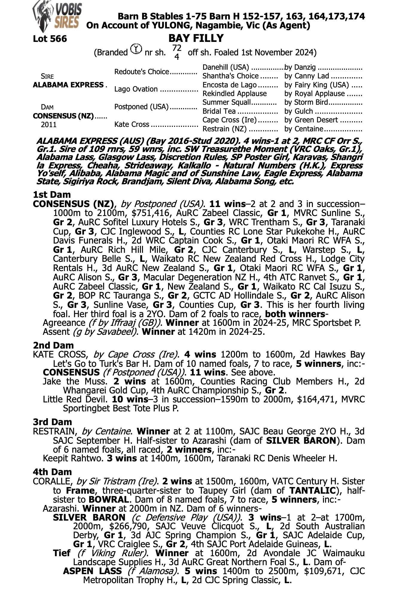 Athletic filly by Alabama Express, the sire of superstar filly TREASURETHEMOMENT, and out of Group 1 winning and multiple Group 1 winning and multiple Group placed mare Consensus (NZ).