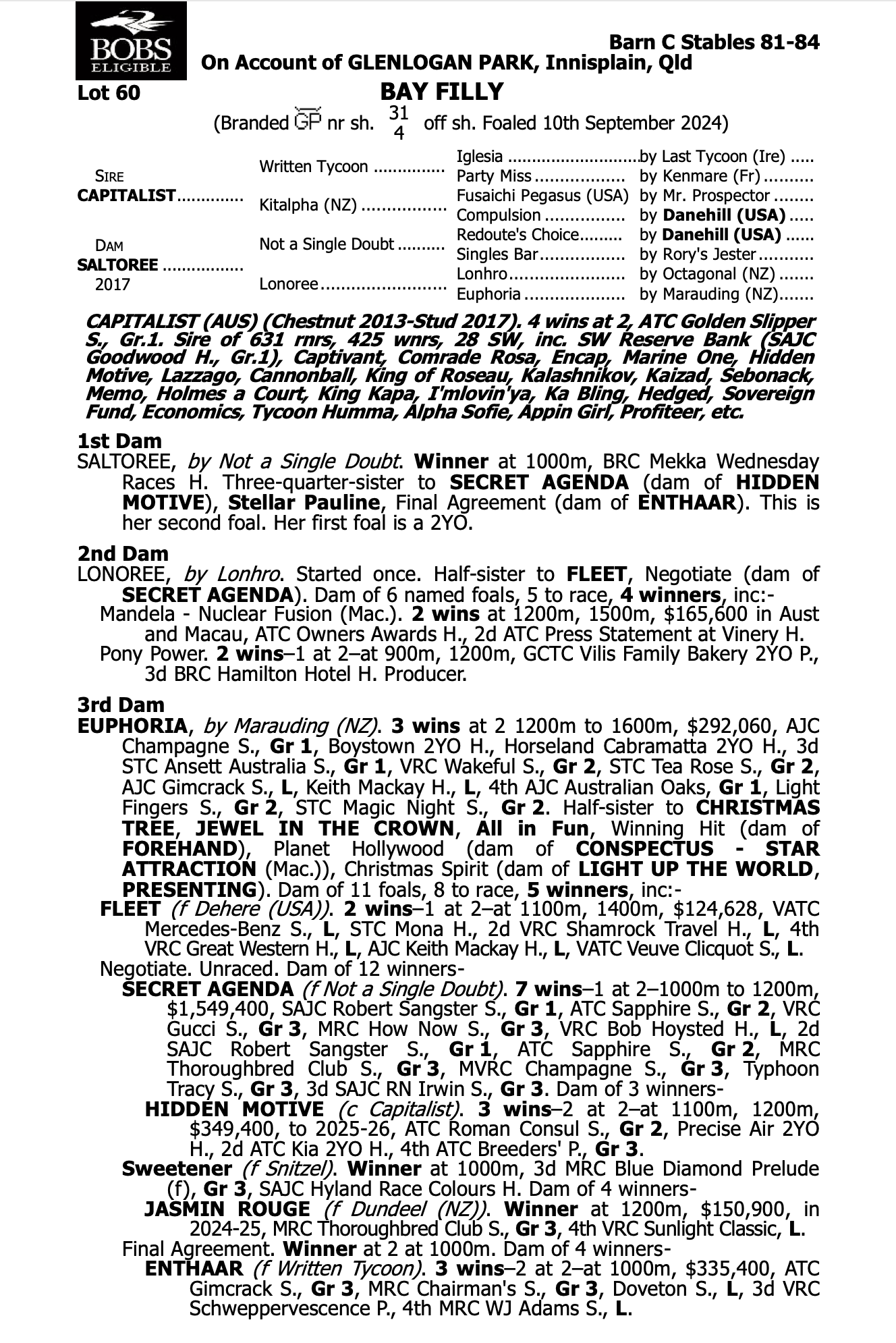 We have made our first purchase of the day at the Inglis Easter Yearling Sale, securing a super strong, sharp filly by one of Australia’s leading 2YO sires, Capitalist. This filly has muscle upon muscle and looks like she could run through a brick wall.