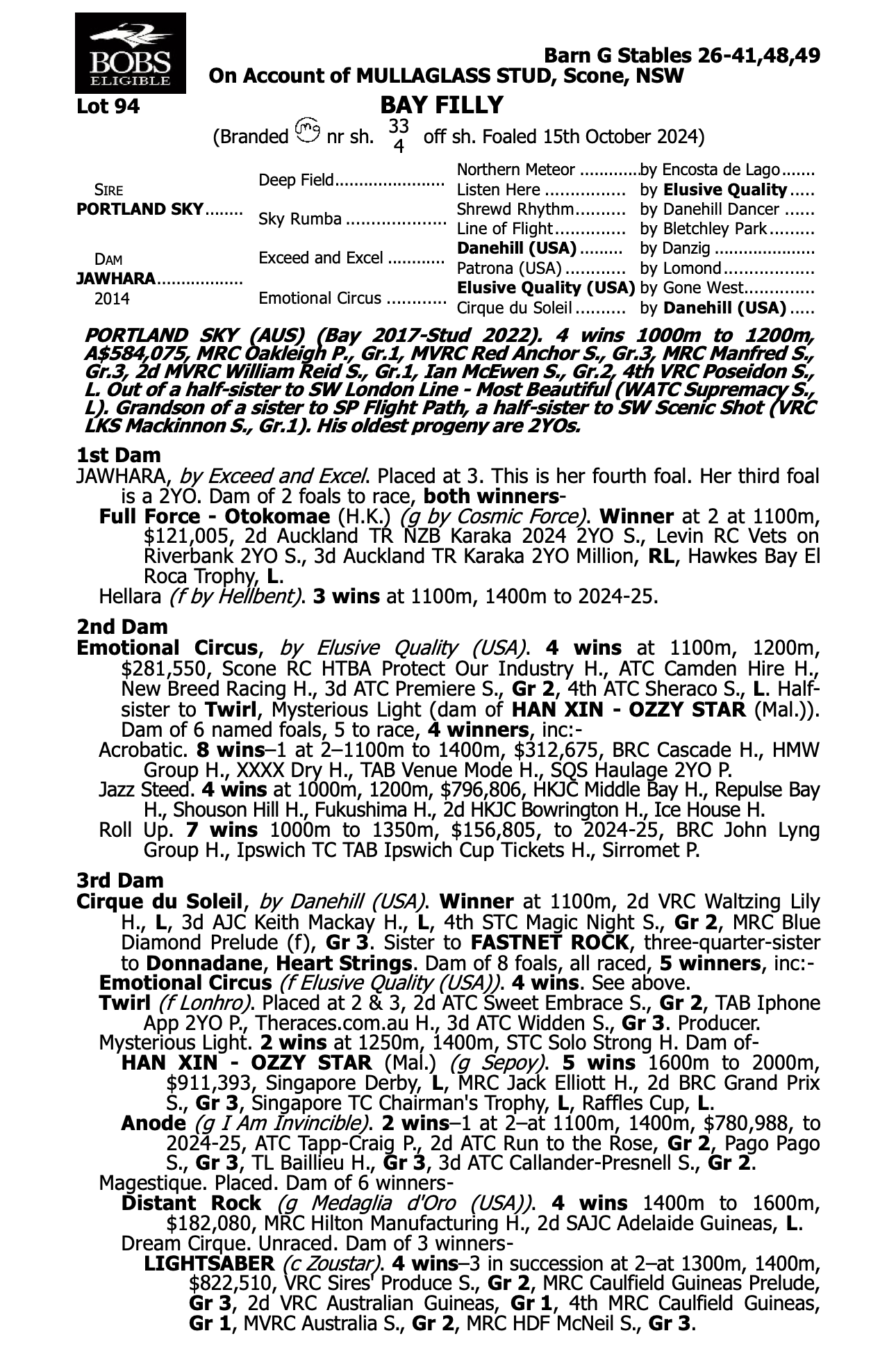 The dam is by one of Australia’s leading broodmare sires in Exceed and Excel, and has produced two winners from two foals to race, most notably the 2YO winner and Listed placegetter Full Force - Otokomae. The dam line traces back to the family of Group 2 winner and sire Lightsaber.